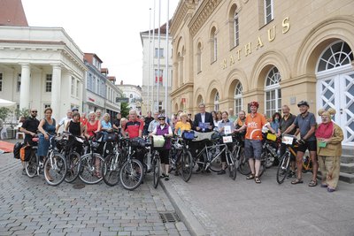 Schweriner Radfahrer starteten gemeinsam mit befreundeten Radlern vom Wuppertaler Verein „Der grüne Weg“ am 2. August zu einer Radtour in unsere schwedische Partnerstadt Växjö. Organisiert wurde die Zweiradreise vom ADFC (Allgemeiner Deutscher Fahrrad-Club) Schwerin – und unterstützt von mehreren Partnern aus Schwerin, unter anderem von der Stadt selbst. Der stellvertretende Vorsitzende des ADFC Schwerin, Roberto Koschmidder (oranges Jersey) begleitete die Karawane bis Rostock. Stadtpräsident Stephan Nolte verabschiedete die Gruppe zuvor am Schweriner Rathaus. Die 420 Kilometer lange Tour war in fünf Etappen unterteilt, nicht immer wurde dabei geradelt: Von Rostock ging es mit der Fähre nach Trelleborg.