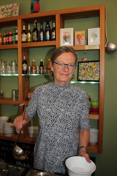 „Genau hier, an dieser Stelle!“ Das antwortet die gebürtige Schwerinerin Christiane Groß auf die Frage nach ihrem Lieblingsplatz in der Stadt. „Genau hier“ ist in der Schloßstraße, hinter dem roten Tresen der Suppenstube. Dort hat Christiane dann eine Kelle in der Hand und füllt an fünf Tagen in der Woche die Schüsseln der vielen Stammgäste. Seit 15 Jahren verwöhnen Christiane Groß und Mathias Schmidt Menschen mit selbstgekochter Suppe. Und es muss mehr dran sein als Kartoffeln und Karotten, wenn die 60-Jährige ihren Arbeitsplatz immer noch als Lieblingsplatz bezeichnet. Für sie ist es ein Wohlfühlort, an den sie jeden Tag gern geht und einen solchen Wohlfühlort will sie auch für andere Menschen daraus machen. Dass es hier familiär zugeht, fängt schon damit an, dass Christiane alle Gäste duzt – auch diejenigen, die