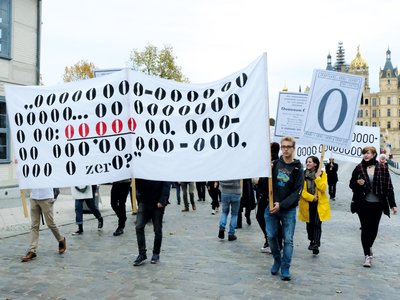 Noch bis zum 13. Januar 2018 zeigt das Staatliche Museum in seiner Galerie Alte & Neue Meister die Ausstellung „Endre Tót: Zer0 makes me glad sad mad“. Unmittelbar vor deren Eröffnung zog eine von Endre Tót veranstaltete „Zero-Demo“ durch die Schweriner Innenstadt – eine künstlerische Aktion, die ganz bewusst die Grenze zum Politischen suchte und herausforderte.