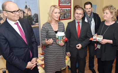 Im Dezember eröffneten die Bundesfamilienministerin Manuela Schwesig (2. v. l.), die EU-Parlamentarierin Iris Hoffmann (r.), der MV-Ministerpräsident Erwin Sellering (l.) sowie der Bundestagsabgeordnete Frank Junge (3. v. l.) ihr neues gemeinsames Bürgerbüro in der Bischofstraße 2. Zu den Gästen zählte unter anderem Schwerins Jugend-, Sozial- und Finanzdezernent Dieter Niesen (2. v. r.).