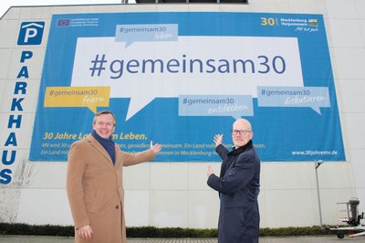 Dr. Heiko Geue, dem Chef der Staatskanzlei, enthüllt. Das Banner weist auf den 30. Geburtstag unseres Bundeslandes hin – MV feiert 2020 dreißig Jahre erfolgreiche Landesentwicklung.