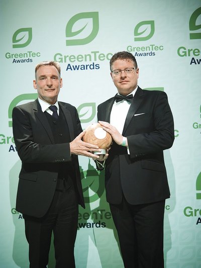 Tobias Struck (r.), der Projektleiter des Wemag-Batteriespeichers, und Clemens Triebel, Vorstand der Younicos AG, nahmen den „GreenTec Award“ bei der feierlichen Preisverleihung in München entgegen.