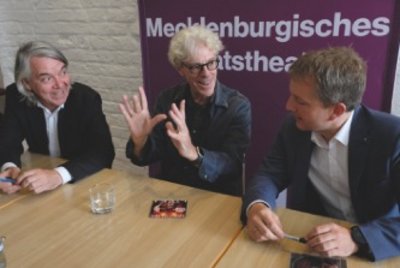 Wieder ein Eintrag ins Goldene Buch der Stadt: Weltklasse-Drummer Stewart Copeland (M.) hat sich darin am Rande seines Auftritts bei den Schlossfestspielen verewigt. Oberbürgermeister Rico Badenschier (r.) outete sich bei dieser Gelegenheit als großer Fan von The Police - der Band, die Copeland gründete und maßgeblich prägte. Die Europapremiere von „The Police Deranged for Orchestra“ mit dem Rockstar und der Mecklenburgischen Staatskapelle als Höhepunkt der diesjährigen Schlossfestspiele war für Generalintendant Hans-Georg Wegner gleichzeitig eine gute Gelegenheit, Bilanz zu ziehen: 17.500 Menschen erlebten 50 Vorstellungen auf vier verschiedenen Bühnen - das entspricht dem Niveau des Vorjahres. Insgesamt zählte das Theater in der durch Corona belasteten Spielzeit 63.000 Besucher. Inzwischen hat der Vorverkauf für die neue