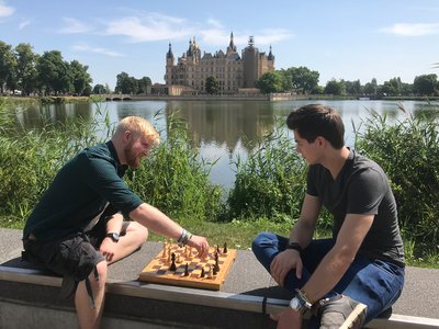 Das königliche Spiel mit Schwerins wunderschönem Schloss als Kulisse: Gern treffen sich die beiden Augenoptiker und Schachbegeisterten Juri und Philippe bei sonnigem Wetter zu einem kleinen Duell an den 64 Feldern unter freiem Himmel. Die Schlosspromenade haben sich die jungen Männer hier für ihre Partie ausgewählt. Wer folgt ihrem Beispiel?
