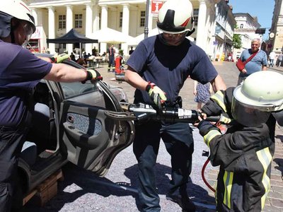 Kürzlich fand auf dem Markt in Schwerin wieder der Mitmach-Tag der Feuerwehren statt. Es beteiligten sich aber auch das DRK und das THW. Die Besucher probierten sich selbst als Feuerwehrleute und Lebensretter aus und folgten den zahlreichen Vorführungen.
