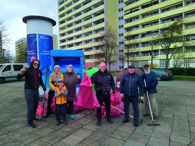 Frühjahrsputz auf dem Großen Dreesch: Der Ortsbeirat hatte aufgerufen und Einwohner packten mit an. Grünflächen, Vorgärten und Parkplätze – die Helfer brachten eine Fläche von mehr als zwei Hektar pünktlich zum Frühlingsstart auf Vordermann. Am Ende standen 16 prall mit Müll und Abfall gefüllte rote Säcke zum Abholen parat. „In der gesamten Woche hatten auch schon aktive Bürger selbstständig Müll gesammelt“, freute sich Ortsbeiratsvorsitzender Georg- Christian Riedel. Bei der Putzaktion selbst kam dem Ortsbeirat außerdem ganz spontan ein ukrainisches Ehepaar mit großer Tatkraft zu Hilfe.