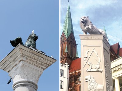 Was macht eigentlich immer dieser Löwe da? Der Markuslöwe ist das Attribut des Evangelisten Markus, dem auch der berühmte Markusdom geweiht ist. Die Venezianer raubten nämlich im 9. Jahrhundert die Gebeine des Heiligen, um eine angemessene Reliquie vorhalten zu können. Der Markuslöwe gelangte daraufhin auch in das venezianische Wappen und ist heute noch in vielen Orten zu finden, die einst zur Republik Venedig gehörten. Die Markussäule auf der Piazzetta di San Marco zeigt das wohl berühmteste Exemplar. Aber auch Schwerin hat einen Löwen auf einer Säule: Das sieben Meter hohe Kunstwerk auf dem Markt erzählt die Geschichte von Stadtgründer Heinrich dem Löwen und kommt während der venezianischen Tage als Markussäule zum Einsatz.