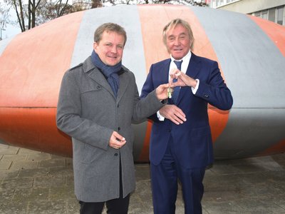 Der Wittenfördener Unternehmer Peter Eckel (r.) ist neuer Besitzer der drei Kunstkissen, die 2006 auf dem Dreescher Markt installiert wurden. Die Kissen bestehen aus Glasfaser und messen jeweils 9,60 mal 6,00 mal 2,80 Meter. Über die Kunstwerke wurde immer wieder diskutiert. Und weil die meisten Schweriner sie nicht mehr haben wollten, beschloss die Stadtvertretung, sie zu beseitigen. Mit Freude übergab Oberbürgermeister Rico Badenschier kürzlich Eckel den Schlüssel zur Demontage.