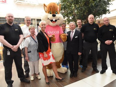 Die Schweriner Marienplatz-Galerie feierte am 6. und 7. Mai ihren 5. Geburtstag mit rund 60.000 Besuchern. Auch im sechsten Jahr werden sich Center-Manager Henner Schacht (4.?v.?r.) und seine Assistentin Peggy Och-Jäck (4.?v.?l.) auf ihr Team verlassen können. Das sieht auch Maggie so, das knuffige Maskottchen des Einkaufszentrums am Marienplatz.
