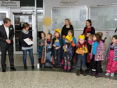 Eine Gruppe kleiner Sternsinger aus der Kindertagesstätte der Katholischen Kirche St. Anna besuchte in der vergangenen Woche das Schweriner Stadthaus. Sie führten ein Programm mit Liedern und Gedichten auf und baten danach um eine milde Gabe für die armen Kinder dieser Welt. Zum Schluss schrieben sie an die Haustür mit Kreide die traditionelle Segensbitte C+M+B ergänzt durch die Jahreszahl 2019.