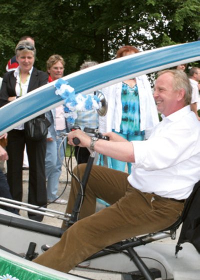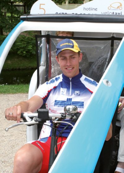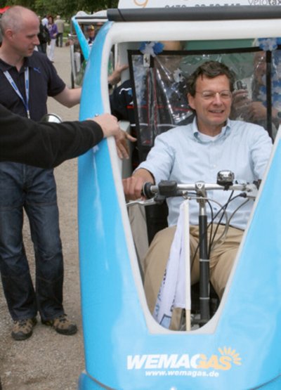 Heißes Wetter - coole Aktion. Am 27. Juni fuhren Prominente auf dem Gelände der Bundesgartenschau mit Velo-Taxis für einen guten Zweck. Gut in Form und natürlich mit sich WEMAG-Vorstand Dr. Andreas Cerbe, Radprofi und Olympiasieger Stefan Nimke, Landwirtschaftsminister Dr. Till Backhaus und Bernhard Gläss, Leiter des Landesmarketings, der sportlichen Herausforderung. Und die BUGA-Gäste kamen in Scharen, ließen sich chauffieren und spendeten dafür einen Obolus. Nach knapp drei Stunden waren 1.000 Euro in der Kasse, für die Waldaktien ausgereicht wurden.