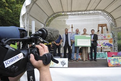 „Schwerin live“ live mit der Kamera dabei: Die Bundesfamilienministerin Manuela Schwesig übergab kürzlich bei einem Fest in Schwerin einen Spendenscheck in Höhe von 8.130 Euro an den Verein Schweriner Tafel. Unter anderem der Vereinsvorsitzende Peter Grosch (r.) freute sich über das Geld, das durch den Verkauf von 32 kleinen Kunstwerken zusammenkam.