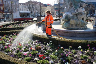 Ende März haben Birgit Kaspari und ihre Kollegen vom städtischen Betrieb SDS die Blumenrabatten am Brunnen auf dem Grunthalplatz bepflanzt und die Blumen ordentlich gewässert, damit sie gut anwachsen. Insgesamt etwa einen Tag haben sie dafür gebraucht. Unter anderem blühen dort nun Bellis, Hornveilchen und Vergissmeinnicht. Ende Mai weichen die Frühlingsblumen dann der Sommerbepflanzung.