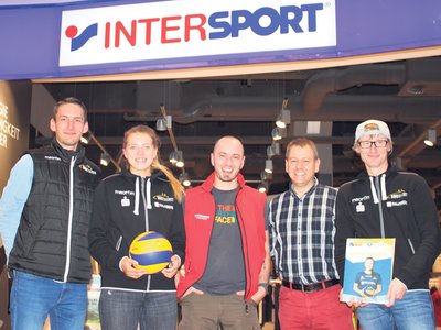 Seit dem Beginn der Bundesliga-Saison unserer Volleyballerinnen vom SSC Palmberg bietet Intersport im Schlosspark-Center Fanartikel des SSC an. Zu haben sind unter anderem Jacken, Trikots, T-Shirts und Schals. Dem Fachgeschäft statteten kürzlich die Spielerin Kaisa Alanko sowie die beiden SSC-Geschäftsstellenmitarbeiter Peter Niepagen (l.) und Christoph Schmidt (r.) einen Besuch ab.