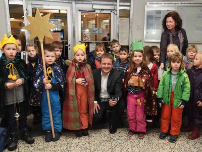 Anfang dieses Monats zogen wieder junge Sternsinger von Haus zu Haus. In Schwerin besuchten die als heilige drei Könige verkleideten Mädchen und Jungen der Gemeinde St. Anna unter anderem das Stadthaus, wo sie von Oberbürgermeister Dr. Rico Badenschier empfangen wurden (Foto), und die Staatskanzlei, wo Staatssekretär Dr. Christian Frenzel ihr Gastgeber war. Nach ihren Lied- und Gedichtvorträgen baten die jungen Dreikönigssänger um Spenden für Not leidende Kinder in der Welt, diesmal speziell für die in Kenia. Landesweit waren rund 1.000 Sternsinger unterwegs.