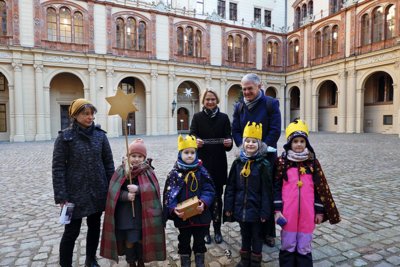 Kleine Sternsinger besuchten am Dreikönigstag, 6. Januar, im Schloss-Innenhof die Landtagspräsidentin Birgit Hesse (Foto oben) und vor der Staatskanzlei Ministerpräsidentin Manuela Schwesig.