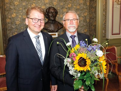 Gleich doppelten Anlass zum Feiern hatte kürzlich Dr. Michael Jungrichter: Er feierte am 22. Juli seinen 70. Geburtstag, und er ist seit mittlerweile 10 Jahren Vorsitzender des Vereins Gesellschaft der Freunde des Mecklenburgischen Staatstheaters Schwerin. Bei einem Empfang zu Ehren Jungrichters am 28. Juli im Flotow-Zimmer gratulierte dem engagierten Kulturförderer auch Staatstheater-Generalintendant Lars Tietje.