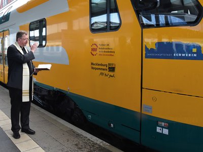 Propst Horst Eberlein hat kürzlich auf dem Schweriner Hauptbahnhof einen Zug der ODEG gesegnet. Eberlein sagt: „Wenn ein Gegenstand gesegnet wird, so bitten wir Gott um seinen besonderen Schutz für diese Sache und die Menschen, die sie nutzen.“ Der Zug wird inzwischen im Fahrgastbetrieb auf der Strecke Wismar-Schwerin-Berlin-Cottbus eingesetzt. Schief gehen kann ja nun nichts mehr.