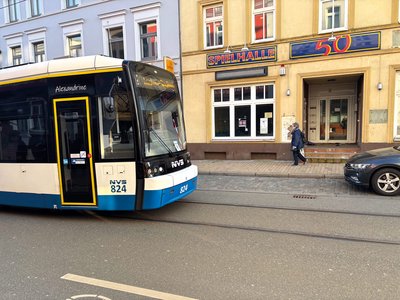 In der Friedensstraße ist aktuell für Autofahrer besondere Vorsicht geboten: Manche ordnen sich aus Gewohnheit falsch in die separat eingerichtete Fahrspur für die Straßenbahn ein. Diese Spur ist aber aktuell für den Kfz-Verkehr gesperrt, da die Straßenbahnen in beide Richtungen verkehren und sowohl die Wittenburger Straße hinauf als auch hinunter fahren. Nötig ist dies durch die umfangreiche Sanierung der Franz-Mehring-Straße.