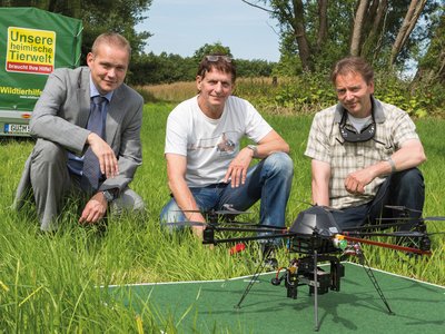 Die WEMAG spendete 2.500 Euro an den Verein Wildtierhilfe MV, der Landwirten den kostenlosen Einsatz von GPS-gesteuerten Fluggeräten (Drohnen) anbietet, um vor Erntebeginn Jungtiere wie Rehkitze oder Hasen und Bodenbrüter in Wiesen und auf Feldern aufzuspüren. Auf dem Foto (v. l.): WEMAG-Vertriebsleiter Michael Hillmann, Vereinsvorsitzender Frank Demke, eine Drohne und der Drohnenpilot Siegfried Talke.