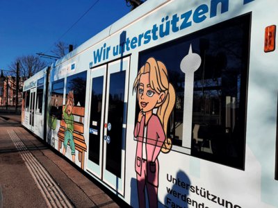 „Wir unterstützen euch!“ ist auf einer Straßenbahn des Schweriner Nahverkehrs zu lesen, die werdende und junge Eltern auf Angebote der Frühen Hilfen aufmerksam macht. Und das mindestens für ein Jahr – so lange soll der Wagen durch Schwerin rollen. „Diese Form der Öffentlichkeitsarbeit ist wesentlich effektiver als Flyer oder Plakate, weil sie der Zielgruppe unweigerlich präsentiert wird, selbst wenn die Eltern öffentliche Verkehrsmittel nicht nutzen“, erläutert der Fachdienstleiter Jugend, Mark Klinkenberg, die Werbeidee. Wer dann mehr wissen möchte, kann den QR-Code scannen, der sich auf der Bahn befindet.