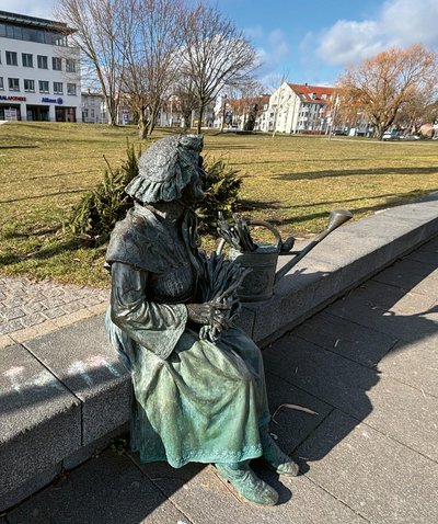 Ein temporäres Werk: Neben der von Bernd Streiter geschaffenen Figur von Blumenfrau Bertha Klingberg gab‘s jetzt eine Ergänzung. Die mit bunter Kreide aufgemalten Blümchen haben zwar ähnlich wie echte Schnittblumen keine lange Lebensdauer, hätten Bertha aber sicherlich gefallen. So entsteht aus Kunst neue Kunst.