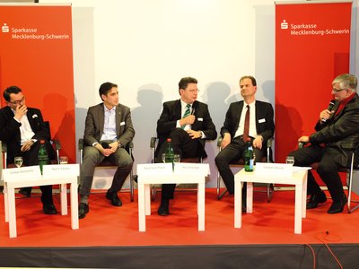 In Hagenow fand kürzlich auf Einladung der Sparkasse Mecklenburg-Schwerin der Wirtschaftstreff 2018 statt. Über 80 Unternehmensvertreter der Region Westmecklenburg nahmen daran teil. Zu einer Podiumsdiskussion begrüßte der Moderator Norbert Bosse Reinhard Meyer, den Chef der Staatskanzlei MV und ehemaligen Wirtschaftsminister Schleswig-Holsteins, den Personalchef der MV Werften Wismar GmbH Björn Cleven, Volker Wünsche, Unternehmenssprecher der Van der Valk Gruppe Deutschland, und Kai Lorenzen, Vorstandsvorsitzender der Sparkasse Mecklenburg-Schwerin.