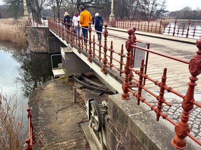 Mit dabei sind auch einige Ziele in Schwerin, darunter die Drehbrücke am Schweriner Schloss. Sie entstand Ende des 19. Jahrhunderts und ersetzte eine hölzerne Klappbrücke, die zuvor Lastkähnen den Weg in den Burgsee frei gemacht hatte. Das war wichtig: So wurde das Heizmaterial direkt zur Anlegestelle in der Ufermauer des Schlosses gebracht – die Tür befindet sich direkt an der Stelle, an der ein einzelner großer Baum steht.