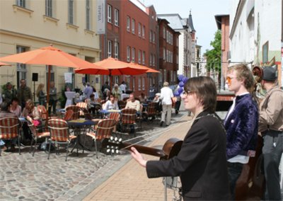 „Heißt jemand von Ihnen Gisela?” Die Besucher des Markttages vor dem Vitanas Senioren Centrum Im Casino in der Pfaffenstraße 3 schmunzeln und schütteln die Köpfe. „Möchte von Ihnen jemand Gisela heißen?” Schallendes Gelächter. Das Eis ist gebrochen - das Straßenkonzert der „Band von letztens” beginnt. Natürlich mit dem Schmachtstück „Gisela”.