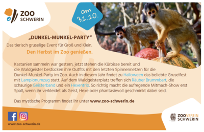 Den Herbst im Zoo genießen. Kastanien sammeln war gestern, jetzt stehen die Kürbisse bereit und die Waldgeister bestücken ihre Outfi ts mit den letzten Spinnennetzen für die Dunkel-Munkel-Party im Zoo. Auch in diesem Jahr fi ndet zu Halloween das beliebte Gruselfest mit Lampionumzug statt. Auf dem Waldgeisterplatz treff en sich Räuber Brummbart, die schaurige Geisterband und ein Hexentrio. So richtig macht die aufregende Mitmach-Show erst Spaß, wenn ihr verkleidet als Geist, Hexe oder phantasievoll geschminkt dabei seid.Das mystische Programm fi ndet ihr unter www.zoo-schwerin.de.