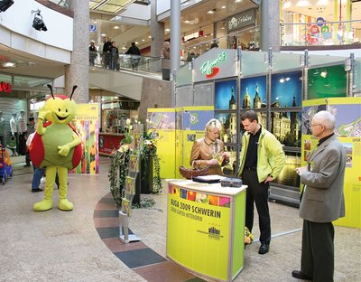 Doch zurück zum eigentlichen Zweck des Schlosspark-Centers, wie es die Schweriner und unzählige Shopping-Touristen von außerhalb lieben. Mit 120 Geschäften auf drei Etagen, die täglich bis 20 Uhr geöffnet sind, ist es zweiffellos der größte Magnet in der Region. Die perfekte Anbindung an die Innenstadt und den Nahverkehr und das riesige Parkhaus tragen ein Übriges dazu bei, dass Jung und Alt hier gern einkaufen gehen. Rund 30 000 Besucher zählt das Schlosspark-Center täglich, in Spitzenzeiten sind es fast 60 000. Etliche über das Jahr verteilte Aktionen, verkaufsoffene Sonntage, das Late-Night-Shopping, Sport, Musik und Kunst, Messen, jahreszeitliche und feiertagsbezogene Feste oder die beliebten Vorher-Nacher-Shows sind zusätzliche Kundenmagneten – die Leute wissen: Dort kann man was erleben.