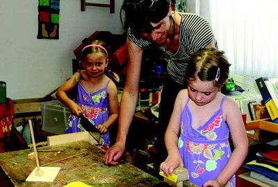 Nebenan basteln Marie und Greta an einem Floß. Eine Mutti unterstützt die beiden handwerklich begabten Mädchen beim Sägen und Schmirgeln.