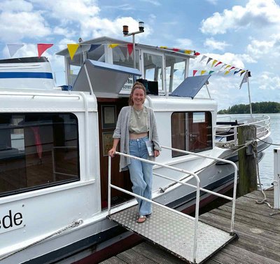 Es ist eine gelungene Kooperation: Christian Getz von der Weißen Flotte und Elisa Witt vom Coworking-Café „tisch“ sitzen nun gemeinsam in einem Boot. Als Übergangslösung für die aktuelle Umzugsphase des Coworking Spaces bietet das Charterboot Elfriede allen tisch-Abonnenten Unterschlupf.
