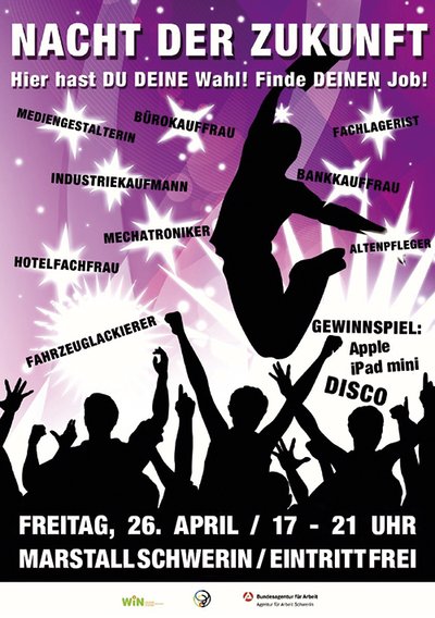 Das ungewöhnliche Umfeld mit bunter Lichtershow und Musik ist Teil des Konzepts. Um 17 Uhr startet die „Nacht der Zukunft“ im Marstall und endet um etwa 21 Uhr mit einer Schülerdisco in der „Club Galerie“. Alle Schüler der Abgangsklassen 2013, 2014 und 2015 aus Schwerin, Ludwigslust, Parchim, Wismar und der Umgebung sind herzlich eingeladen, einen Abend lang mit ihren Freunden oder sogar gemeinsam mit den Eltern Ideen für die Zeit nach der Schule zu sammeln. Und auch regionale Ausbildungsbetriebe, die ihre Teilnahme bisher noch nicht angemeldet haben, sind willkommen, sich in gelöster Atmosphäre auf Personalsuche zu begeben.