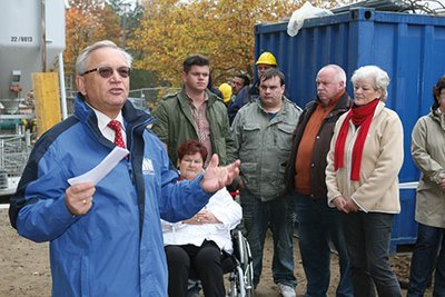 Als Bauarbeiter Holger Höfs nach dem Richtspruch sein gerade entleertes Glas auf den frischen Beton des Rohbaus in der Pilaer Straße 2b warf, wollte es nicht zerspringen. Raunen bei den zahlreichen Gästen. „Oh, da muss ich noch schnell einen Trinken”, meinte der Baulöwe und siehe da: kurz darauf gab es die ersehnten Scherben. Stürmischer Applaus, fröhliches Lachen.