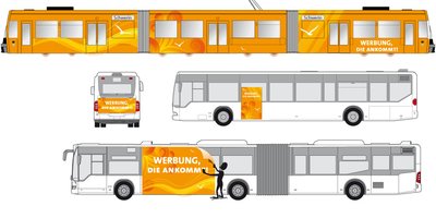 Es müssen aber nicht unbedingt nur die großen Flächen für den großen Geldbeutel sein, um diese starken Medien zu belegen. Kleinere Werbeflächen wie zum Beispiel Seitenscheibenplakate – diese sind beidseitig lesbar und beeindrucken durch ihre hohe Werbewirkung aufgrund der Verweildauer der Fahrgäste – oder Heckscheibenplakate sowie Heckflächenplakate erzielen ebenso gute Effekte.