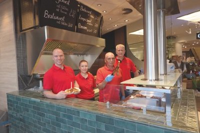 Köstliches vom Grill bekommen Besucher der Marienplatz-Galerie ab sofort von der Fleischerei Lange serviert. Gleich am Eingang der Galerie mit geöffneten Glastüren zum Marienplatz duftet es im neu gestalteten Lange-Grill nach Bratwurst, Currywurst & Co. Und das ist noch längst nicht alles, was der Rost hier hergibt: Fleischkäse-Brötchen und Buletten-Brötchen werden von den Mitarbeitern genauso serviert wie Langes Spezi – eine kräftig gewürzte Krakauer. Dazu kommen knusprige Pommes, die jeden Snack erst perfekt machen. Für Uwe Lange ist diese Art des Verkaufs eine Premiere. Die Idee zum Grill existiert schon seit einigen Jahren – nun wird sie umgesetzt. Mit Stehtischen zur Seite des Marienplatzes bietet der Lange-Grill auch all denen die Chance zu einer Pause, die das Treiben auf dem Platz und die Straßenbahn im Auge behalten wollen. Wer mehr Zeit hat, findet im Geschäft auch einen Sitzplatz.