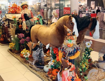 Der Herbst ist da. In der Marienplatz-Galerie wird die goldene Jahreszeit mit fantasievollen Dekorationen begrüßt. Auch ein paar lustige Halloween-Figuren haben sich unter das Volk gemischt. Hauptattraktion ist die große doppelspännige Erntekutsche am Eingang, umringt von einer fröhlichen Gesellschaft und bunten Herbstblumen.