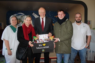 Der Markt Edeka Nötzelmann (im Schlosspark-Center) spendete dem Förderverein „Kinder in der Kinderklinik“ 900 Euro in bar plus eine große Kiste mit Saft und Süßigkeiten zum Nikolaustag. Der Vereinsvorsitzende Prof. Dr. Peter Clemens nahm die Spende im Spielzimmer der Schweriner Klinik entgegen.