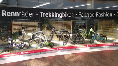 Ab dem 26. September ist auf mehr als 1.700 Quadratmetern im zweiten Obergeschoss der Marienplatz-Galerie alles zu finden, was zum Fahrradfahren dazugehört: Kinder- und Jugendfahrräder, eine enorme Auswahl an E-Bikes, Mountainbikes, Renn-, Cross-, Triathlonbikes, City- und Urbanräder und vieles mehr.