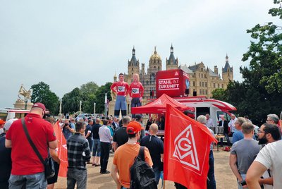 Mitglieder der IG Metall demonstrierten im Juni vor dem Schloss für den Erhalt der Werften im Land. Mit Erfolg – der Landtag sagte seine Unterstütztung zu. Unter die Gewerkschafter hatten sich auch Politiker gemischt, unter anderem MV-Wirtschaftsminister Harry Glawe.