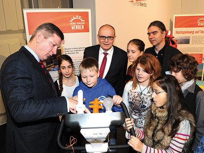 Beeindruckt von der versammelten Polit-Prominenz zeigten sich auch neun Schüler des Schweriner Goethe-Gymnasiums. Die Sechstklässler waren eingeladen, die Mitmach-Ausstellung „Energie gemeinsam wenden“ zu eröffnen und auszuprobieren. Das Projekt verdeutlicht an zehn Stationen mit unterschiedlichen Aufgaben die Erzeugung und die Bedeutung erneuerbarer Energien. Auf einem Spielteppich verwandelt sich dabei die „alte“ Strom-Landschaft nach und nach in eine Zukunftsvision von nachhaltiger Energieversorgung.