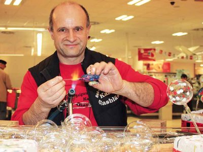 Eine selbst bemalte handgemachte Kugel schmückt den heimischen Tannenbaum ganz besonders und individuell. Weihnachtskugeln und dieses Jahr auch Weihnachtsgurken bemalen – das können sowohl Kinder als auch Erwachsene beim Glasbläser Kalook Wollny, der noch bis zum 22. Dezember in der