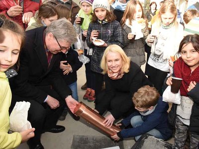 In einem Jahr soll der neue Hort für die Heinrich-Heine-Grundschule fertig sein, der Grundstein dafür wurde im März dieses Jahres gelegt. Stadtpräsident Stephan Nolte sagt: „Die Debatte um Doppelbelegung von Klassenräumen für Hort und Schule hat damit ein Ende.“