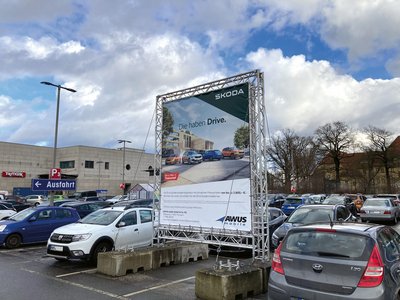 Eine interessante Anlage ist die Sonderwerbefläche auf der obersten Parkebene: Hier kann ein Gestell zwischen den Parkflächen mit einem großen Banner bespannt werden. Weitere Open-Air-Flächen kommen an Laternenmasten dazu.