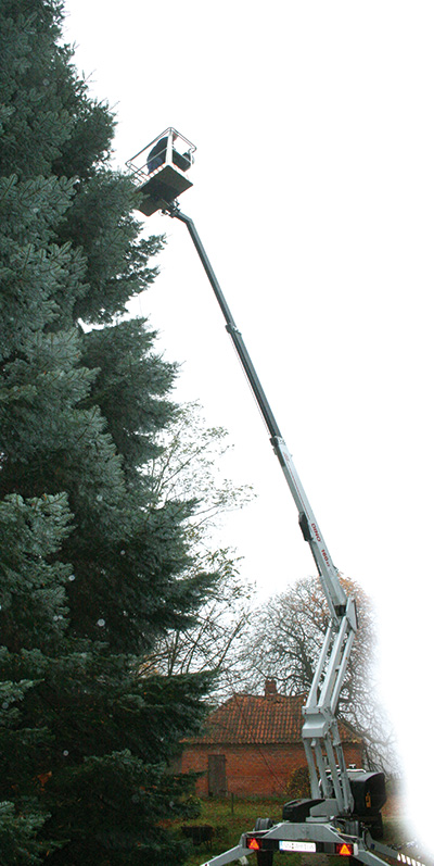 Wieder leuchten die Kerzen, wieder stellt sich beim Anblick all des weihnachtlichen Schmuckes frohe Stimmung ein – morgen Kinder wird‘s was geben! Doch wie kommt eigentlich die Lichterkette hoch oben in den großen Tannenbaum? Wohl dem, der dem Nachwuchs diese Frage beantworten kann: In den meisten Fällen wird diese Dekorationsarbeit in gro-ßer Höhe von Männern auf einer Hebebühne geleistet. Der „Dino 160” aus dem Verleih ABS ist einer dieser Multitalente, die nicht nur zur Weihnachtszeit, sondern über das ganze Jahr hinweg in den unterschiedlichsten Aufgabenbereichen wertvolle Dienste leisten. Die selbstfahrenden Hebebühne kann in Höhen von bis zu 16 Metern eingesetzt werden. Hoch oben auf der Plattform erreicht man deshalb mühelos auch Fallrohre, Dachrinnen, -giebel – und eben Tannenwipfel. Auch versetztes Arbeiten in verschiedenen Winkeln ist möglich.