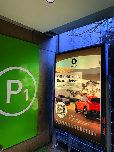 Generell gilt, dass die Werbeanlagen an strategisch günstigen Stellen zu finden sind: in der Nähe von Kassenautomaten sowie Ein- und Ausgängen, an der „Stromtankstelle“ auf Parkebene 1, neben den Ausfahrten. In den Garagen bieten die Deckenbalken weitere Möglichkeiten der Ansprache: Sie können mittels Aufkleber für die Werbung genutzt werden. Eine interessante Anlage ist die Sonderwerbefläche auf der obersten Parkebene: Hier kann ein Gestell zwischen den Parkflächen mit einem großen Banner bespannt werden. Weitere Open-Air-Flächen kommen an Laternenmasten dazu.