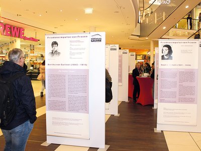 Barbara Messmer von der Anthroposophischen Gesellschaft. Messmer führte anschließend auch Besucher durch die Schautafeln, informierte über die dargestellten Friedensaktivistinnen und die Entstehung der Ausstellung. Zu sehen sind die Porträts in der Marienplatz-Galerie noch bis zum 27. Februar.