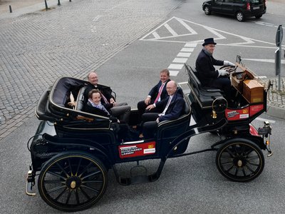 MV-Energieminister Christian Pegel fuhr ganz umweltfreundlich mit der E-Kutsche von seinem Amtssitz in der Schloßstraße zur Konferenz im Ludwig-Bölkow-Haus. Mit ihm nahmen in der Kutsche Platz: Oberbürgermeister Dr. Rico Badenschier, Dr. Regina Dube vom Bundesumweltministerium sowie der Meteorologe Sven Plöger, der auch die Regionalkonferenz moderierte.