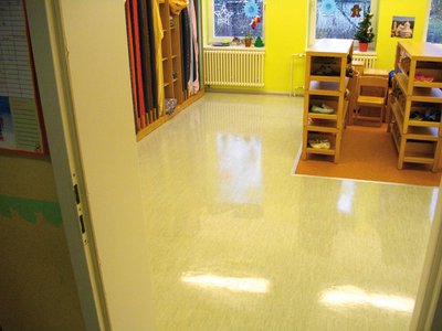 „Wir haben eine Grundreinigung von A bis Z durchgeführt. Das begann bei der Glas- und Rahmenreinigung, außerdem wurden alle sanitären Anlagen und Einrichtungsgegenstände geputzt. Weiterhin standen die Heizungen und Türen auf dem Programm“, fasst HDS-Chef Christian Feichtinger zusammen. Besonderes Augenmerk legte Feichtinger mit seinem Team auf die Bodenpflege. Zum einen wurde sich auch über die Fliesenwände und -böden hergemacht, zum anderen genossen die PVC-Beläge besondere Aufmerksamkeit. „Nach deren Grundreinigung haben wir anschließend die Oberflächen beschichtet“, berichtet Feichtinger. Durch die Beschichtung werde die tägliche Reinigung ungemein erleichtert. Die Wischbezüge gleiten so viel besser über den Boden, wenn er feucht gewischt wird. Der Pflegefilm der Beschichtung schützt außerdem das PVC vor mechanischen Beanspruchungen wie Kratzern. Wissenschaftliche Untersuchungen haben ergeben, dass sich dadurch die Lebensdauer der Bodenbeläge verlängert. Die Oberfläche ist hygienischer; in den Poren eines unbeschichteten Belages kann sich Schmutz absetzen, so dass sich im Schmutz Krankheitskeime rasch vermehren können. „Und die Optik, wie der Glanz, wird verbessert“, argumentiert Feichtinger. Eine Beschichtung sorgt zusätzlich für eine bessere Trittsicherheit. Die Kinder werden in diesem Jahr weniger in ihrer Kita ausrutschen.
